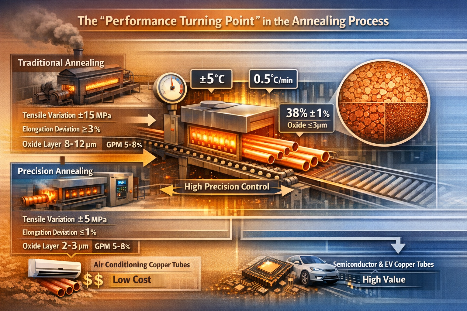 Desde la perspectiva de los escenarios de aplicación, las diferencias en los detalles del proceso de recocido determinan directamente el segmento de mercado del producto. Los tubos de cobre convencionales para acondicionadores de aire tienen menores requisitos de precisión de recocido y los procesos tradicionales pueden satisfacer la demanda; Estos productos tienen un margen de beneficio bruto de sólo el 5%-8%. Sin embargo, los tubos de cobre ultrafinos para semiconductores y los tubos de cobre de paredes delgadas para gestión térmica en vehículos de nueva energía requieren no sólo que los productos recocidos cumplan con los estándares de dureza y conductividad térmica, sino que también exigen una consistencia extremadamente alta en el rendimiento. Sólo los procesos de recocido de precisión pueden lograr una producción en masa, y estos productos pueden tener un margen de beneficio bruto del 25% al 40%. Los estándares de adquisición de un fabricante de equipos semiconductores muestran que el alargamiento de sus tubos de cobre correspondientes después del recocido debe ser estable en 38% ± 1%, y el espesor de la capa de óxido no debe exceder los 3μm. Sólo unas pocas empresas nacionales que utilizan equipos de recocido importados pueden cumplir con este estándar, mientras que la mayoría de las empresas que dependen de procesos tradicionales pierden pedidos de alta gama.