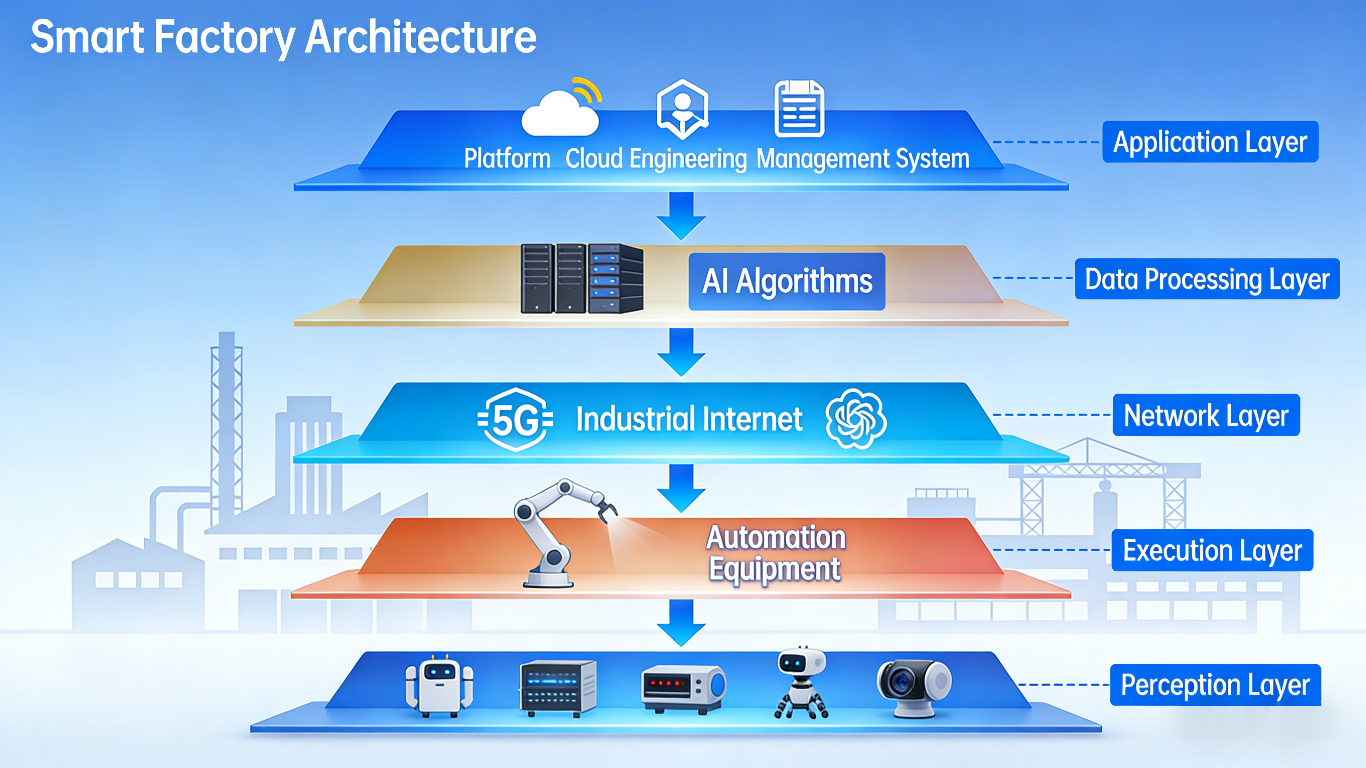 Figura: La arquitectura de fábrica inteligente generalmente incluye capas de percepción, red, procesamiento de datos, ejecución y aplicación, lo que permite el flujo de datos desde los sensores a las plataformas en la nube.
