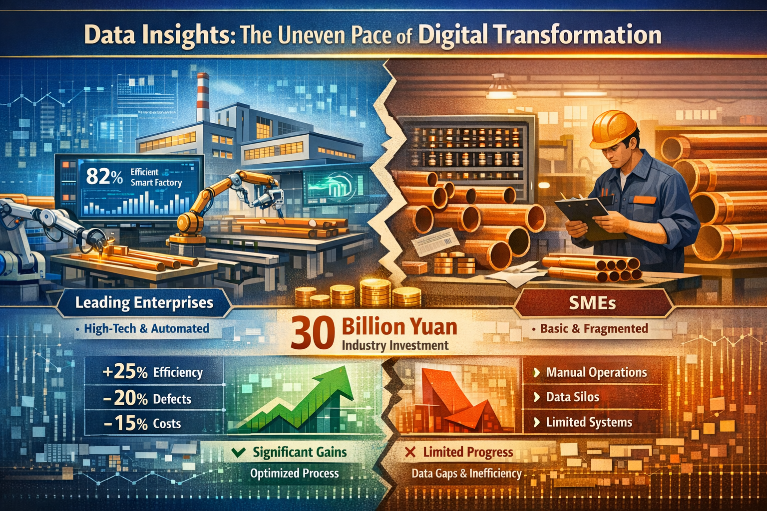 La polarización en la transformación digital de la industria de tubos de cobre no se debe simplemente a diferencias en la inversión de capital, sino más bien al resultado de los efectos combinados de cuatro factores centrales: sesgos cognitivos , idoneidad tecnológica , apoyo al talento , y planificación estratégica . Una investigación en profundidad de la industria revela que las dificultades de transformación que enfrentan la mayoría de las pequeñas y medianas empresas son esencialmente la consecuencia inevitable de una lógica de transformación que prioriza la forma sobre el fondo.