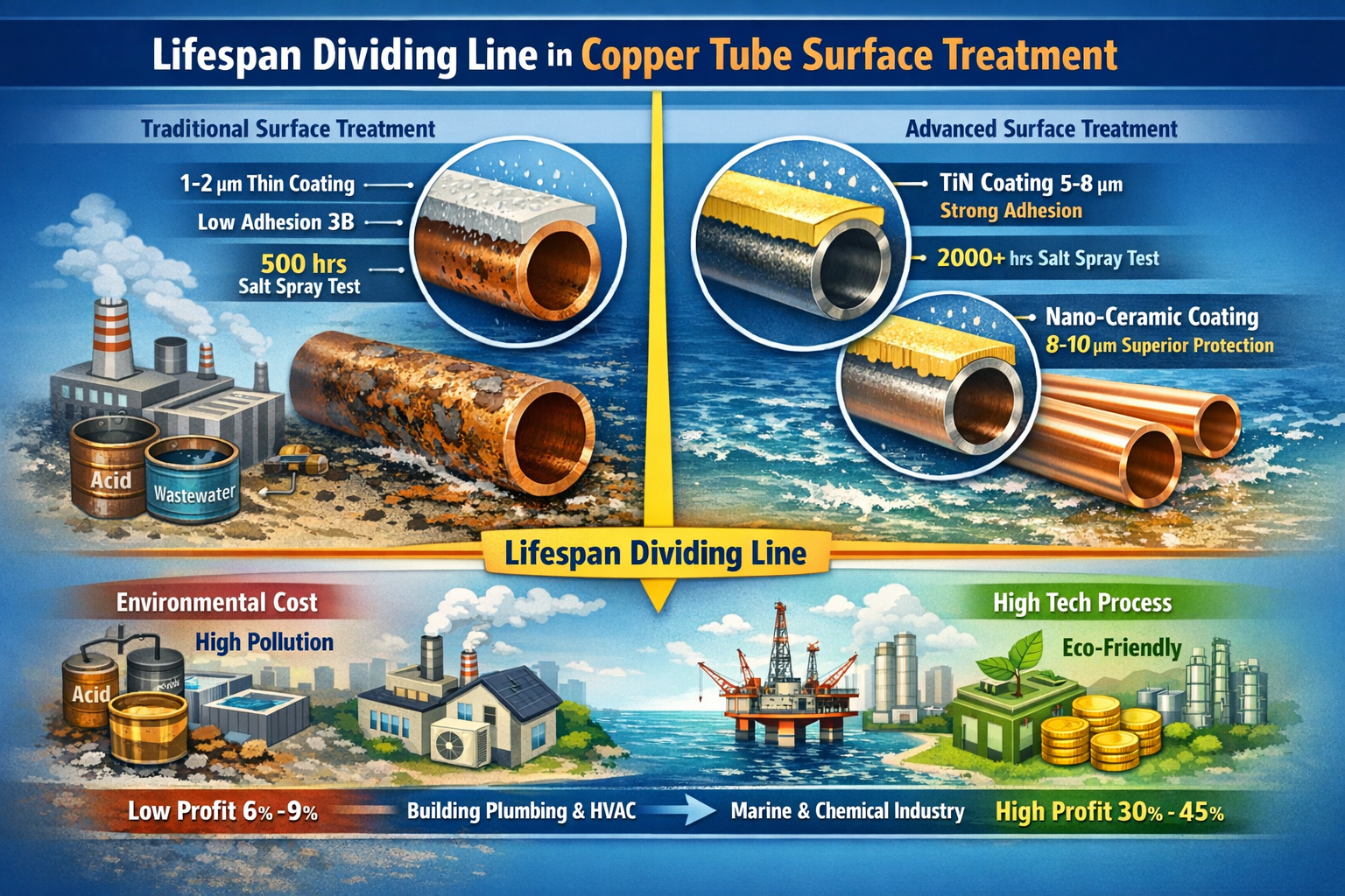 “Ambos son tubos de cobre utilizado en equipo de desalinización de agua de mar , pero los productos con los que tratamos Decapado y pasivación convencional. mostró corrosión por picaduras y fugas en menos de 3 años en el medio marino; mientras que el producto de la competencia, tratado con tecnología de revestimiento de iones al vacío , tiene una vida útil de más de 15 años y su precio unitario es un 30% más alto que el nuestro”. El Sr. Liu, director técnico de una empresa de tubos de aleación de cobre en Qingdao, levantó dos secciones de tubos de cobre intactos y desechados, revelyo el valor oculto de la tecnología de tratamiento de superficies. El tratamiento de la superficie, como paso final en la producción de tubos de cobre, puede parecer una simple operación auxiliar de "eliminación de óxido y recubrimiento", pero determina directamente la calidad del producto. resistencia a la corrosión, resistencia al desgaste , y vida útil , y further impacts its market positioning and added value. Currently, most domestic copper tube manufacturers still rely on traditional surface treatment processes such as Decapado y pasivación ordinaria. , lo que hace que sus productos no sean adecuados para entornos exigentes como Tratamiento de agua marina, química y de alta gama. ; Algunas empresas, sin embargo, han mejorado su tecnologías refinadas de tratamiento de superficies , lo que permite que sus tubos de cobre mantengan un rendimiento estable en entornos extremos y capturen fácilmente el mercado de alta gama. Esta delgada " película protectora " se está convirtiendo en un detalle central que diferencia la competitividad de los productos de tubos de cobre y también es la clave para la mejora de la industria de "calificada" a "de alta calidad".