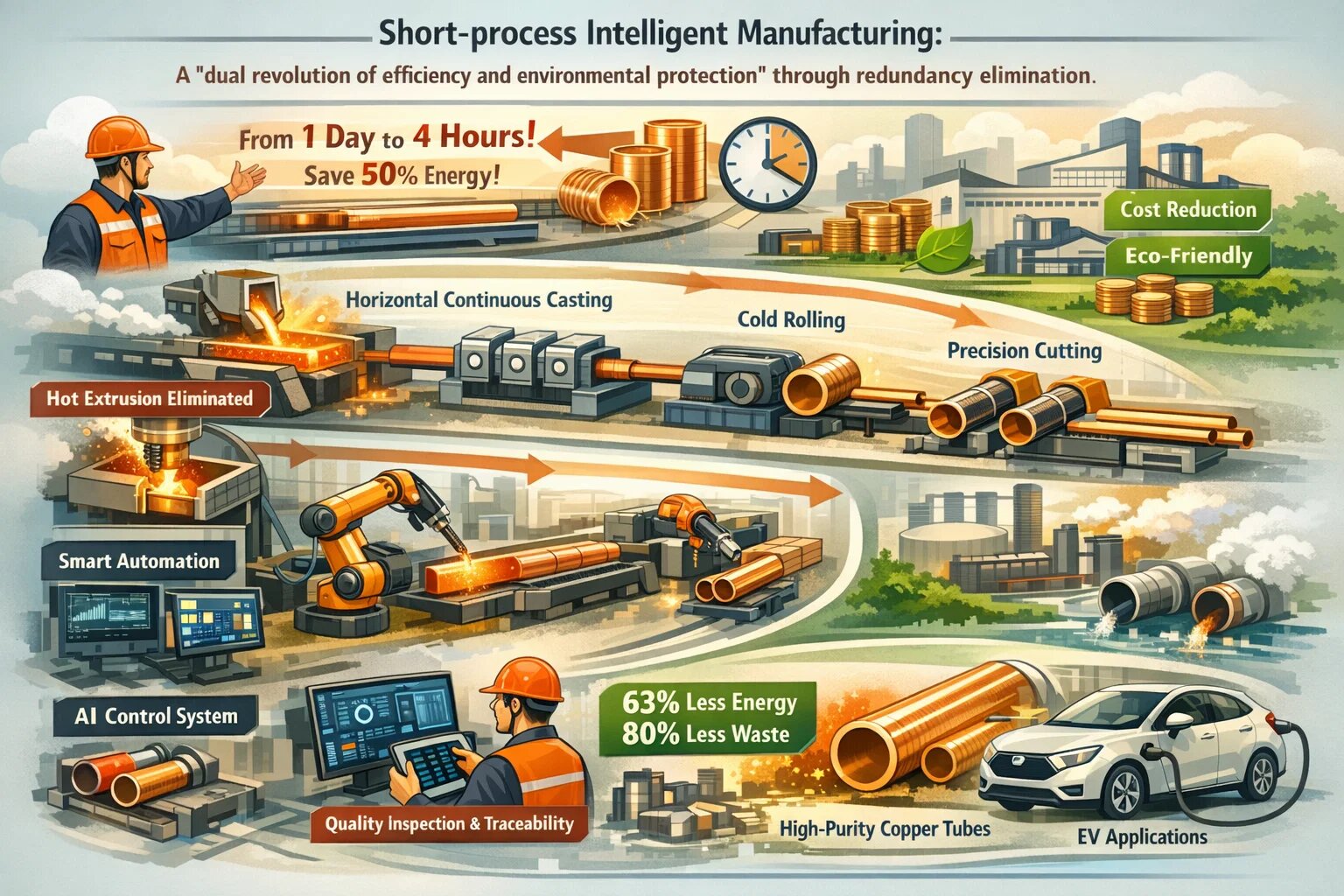 Los principales avances residen en la "simplificación de procesos" y el "empoderamiento inteligente". El paso tradicional de "extrusión en caliente" se elimina directamente y se utiliza tecnología de fundición asistida por ultrasonidos para optimizar la estructura cristalina del tubo en bruto, lo que reduce la segregación del metal y da como resultado una rugosidad de la superficie interna de ≤0,8 μm, lo que le permite pasar directamente al proceso de laminación en frío sin pulido posterior. En la línea de producción de proceso corto de "tres hornos en estado caliente" de Southwest Copper, la configuración integrada de "refinación en horno de ánodo rotatorio de fundición de soplado lateral enriquecido con oxígeno y soplado superior de múltiples lanzas" logra una producción continua desde concentrado de cobre hasta cobre de ánodo, con una capacidad de procesamiento anual de 1,6 millones de toneladas. Esto reduce tres pasos de transferencia en comparación con los procesos tradicionales y comprime la huella del equipo en un 40%.