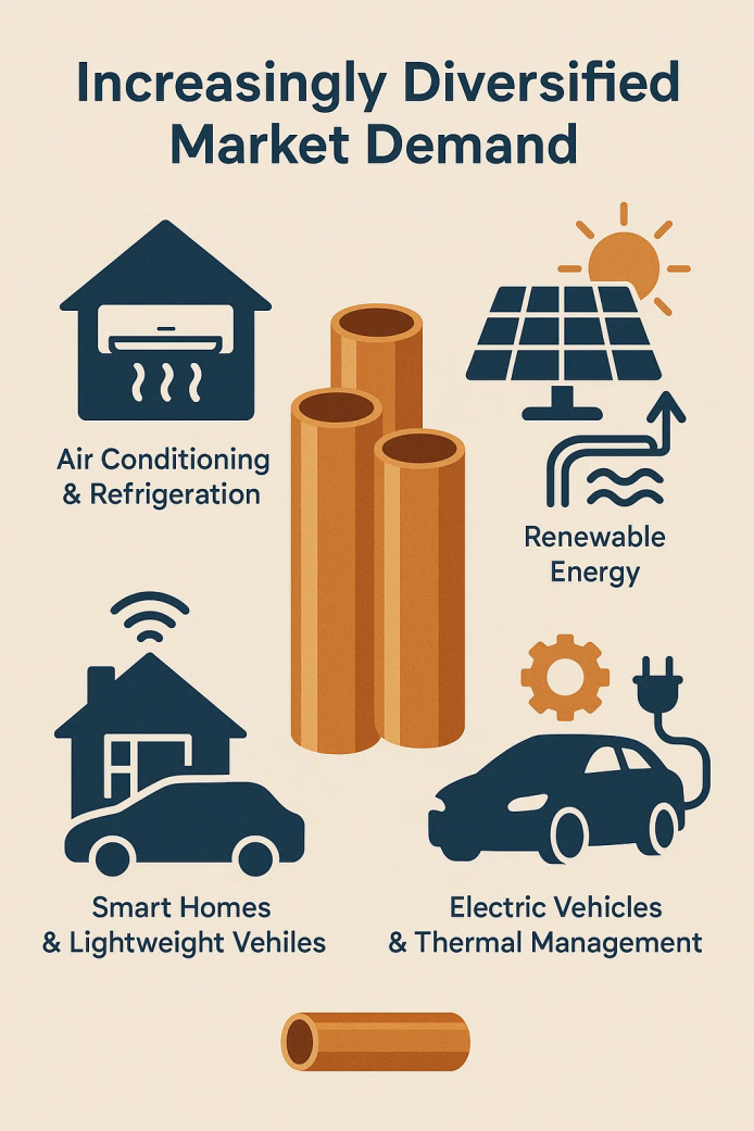 Con el desarrollo acelerado de casas inteligentes, vehículos livianos y electrificación, los escenarios de aplicación de los tubos de cobre también se están expandiendo. Los tubos de cobre de alto rendimiento no son solo componentes centrales para condensadores y evaporadores en los electrodomésticos, sino que también juegan un papel crucial en los sistemas de gestión térmica de nuevos vehículos de energía. Se espera que este mercado continúe creciendo.