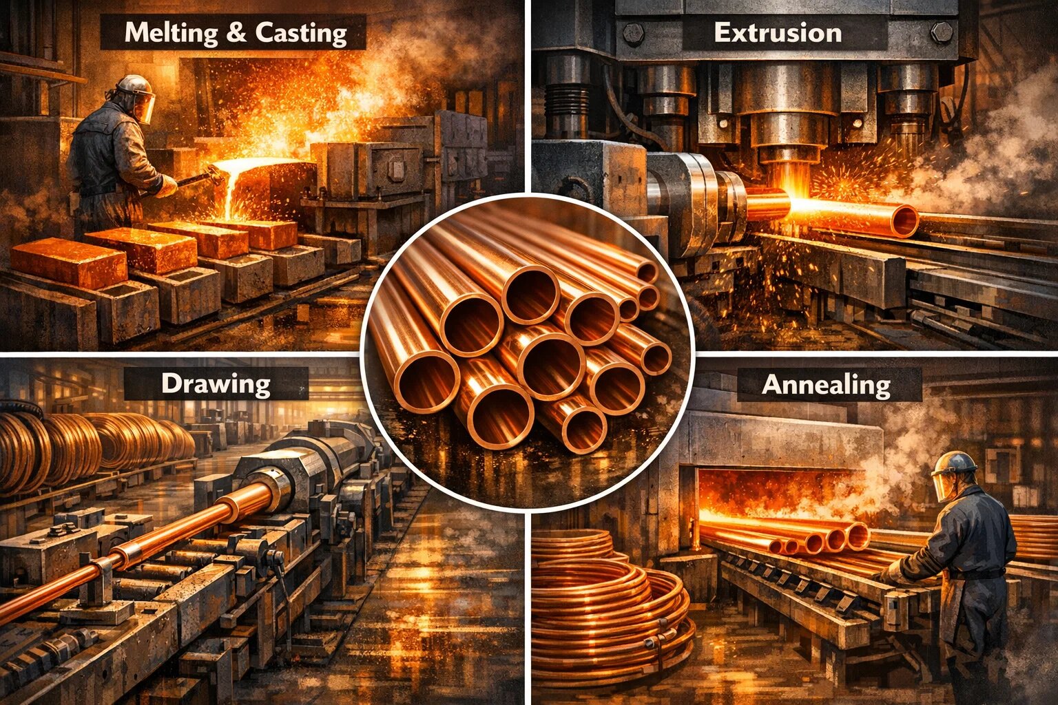Entrar en una fábrica de tubos de cobre es como entrar en un mundo de fuego y precisión. El proceso de convertir un pesado bloque de metal en un tubo delgado y hueco es una proeza de la ingeniería. Dividámoslo en cuatro sencillos pasos: