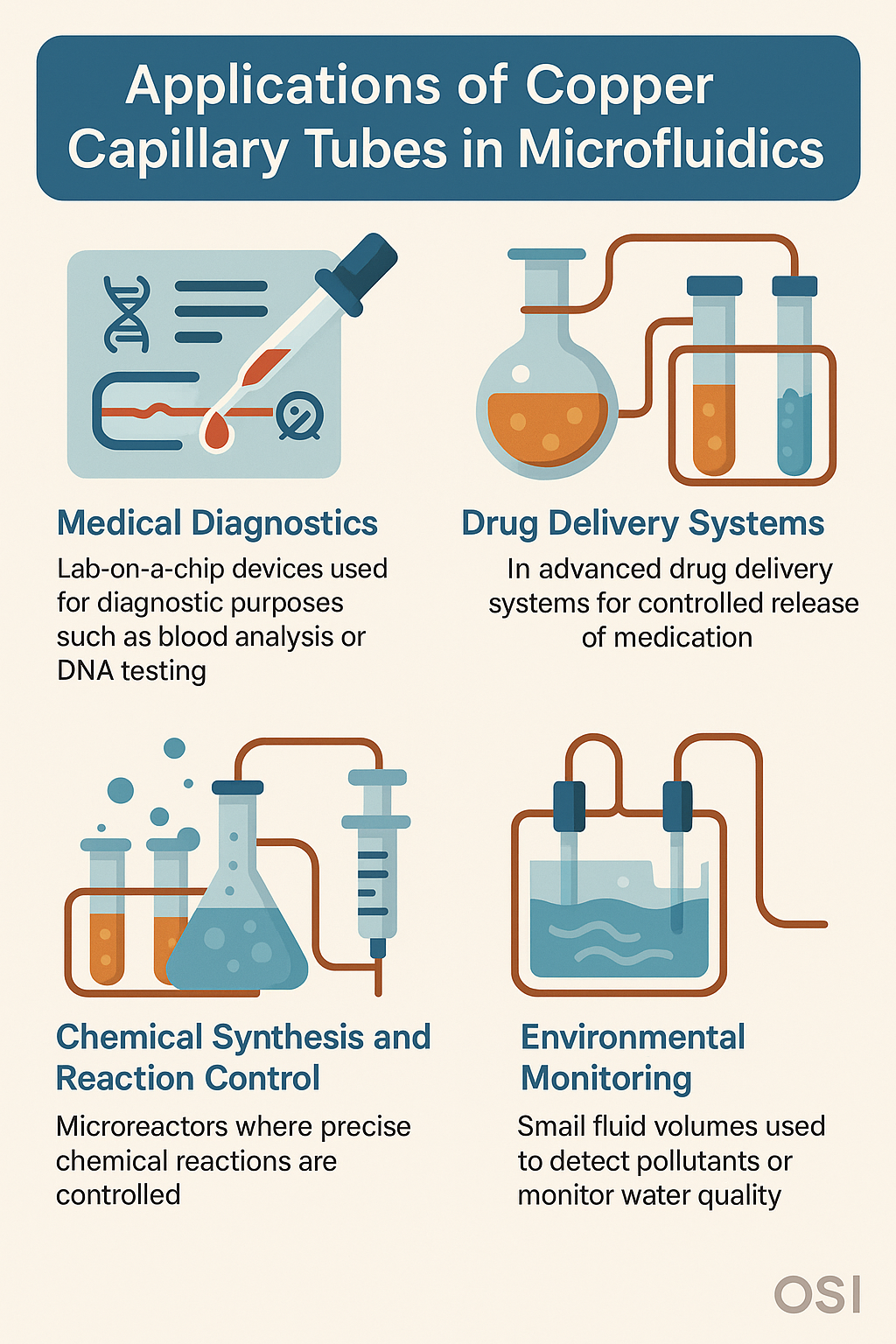 La versatilidad de tubos capilares de cobre les permite ser utilizados en una variedad de aplicaciones de microfluidos. Algunos de los campos más destacados donde se emplean estos tubos incluyen: