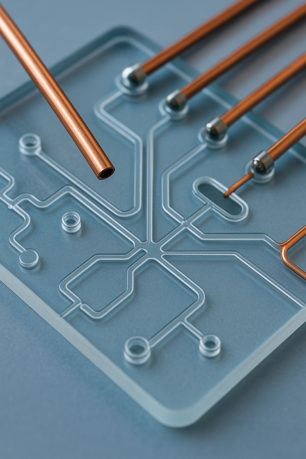 Laboratorio en un chip Los dispositivos utilizados con fines de diagnóstico, como análisis de sangre o pruebas de ADN, requieren un control preciso de los fluidos. Tubos capilares de cobre. son ideales para estos dispositivos, ya que ayudan a llevar fluidos a las zonas de reacción mientras mantienen el control de la temperatura. Las propiedades antimicrobianas del cobre también garantizan que el sistema permanezca estéril, evitando la contaminación que podría afectar la precisión de los resultados.