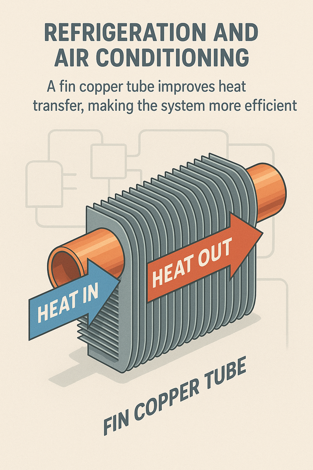 En los sistemas de aire acondicionado, los tubos de cobre con aletas se utilizan ampliamente en serpentines de evaporadores y condensadores. El evaporador absorbe calor del aire dentro del edificio, mientras que el condensador libera el calor al ambiente exterior. El uso de tubos de aletas de cobre en ambos componentes mejora la eficiencia general de la transferencia de calor, lo que conduce a un mejor rendimiento de refrigeración y un menor consumo de energía.