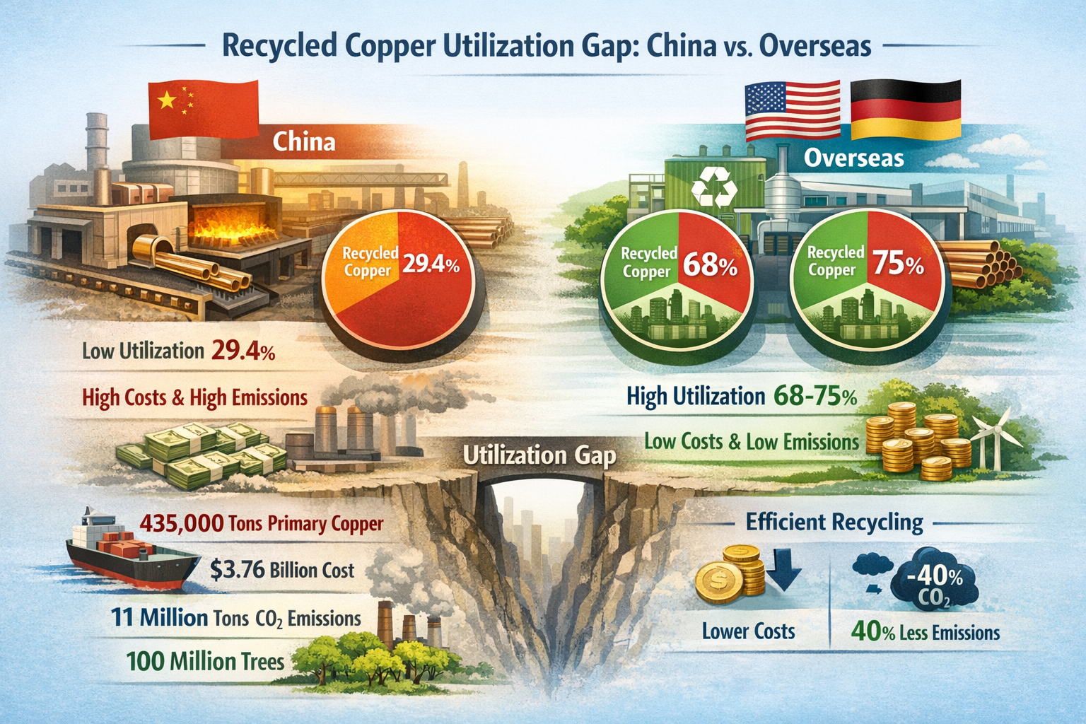 “Producir una tonelada de tubo de cobre "El uso de cobre reciclado ahorra casi 2.000 yuanes en comparación con el uso de cobre virgen y también reduce las emisiones de carbono en más del 80%, pero no nos atrevemos a utilizar más del 25% de cobre reciclado", dice el Sr. Zhang, director de producción de una empresa procesadora de tubos de cobre en Zhejiang. Su dilema refleja la ansiedad colectiva de la industria de tubos de cobre de China en el camino hacia una economía circular. Como mayor consumidor y productor de tubos de cobre del mundo, la tasa de utilización de cobre reciclado en el sector de tubos de cobre de China ha oscilado durante mucho tiempo entre el 28% y el 30%, mientras que en países desarrollados como Estados Unidos y Alemania, esta proporción generalmente excede el 60%, y algunas empresas incluso alcanzan el 80%. Por un lado, existe una reserva anual de más de 12 millones de toneladas de recursos de chatarra de cobre; por otro lado, las empresas dudan en aprovechar plenamente los beneficios del cobre reciclado. ¿Por qué la industria de tubos de cobre de China está luchyo por capitalizar el "dividendo de la economía circular" que ofrece el cobre reciclado? Detrás de esto se esconden múltiples obstáculos en los sistemas de reciclaje de recursos, estándares de calidad, procesos tecnológicos y políticas de apoyo, y también encierra la clave para la transformación verde de la industria.